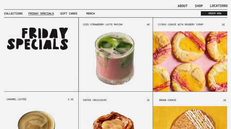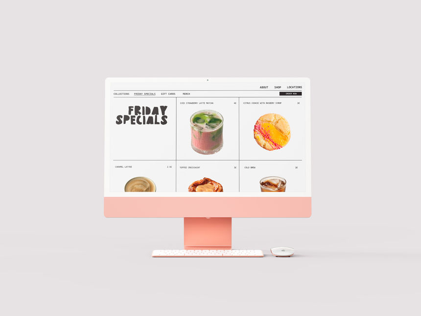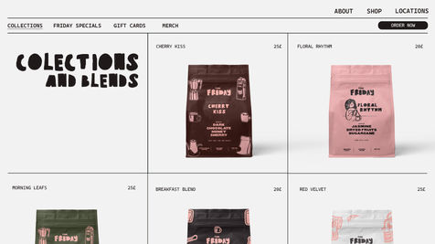 I wanted the website to be simple and functional enough, so I created a simple layout with three sections Shop, About and Locations. Whenever you click on Shop it would open other four sections like collections, Friday specials, gift cards and merch. There you could order products like coffee and treats (or see more information about allergies), merchandise (hoodies, tote bags with records), and finally, different types of gift cards and a free loyalty card.